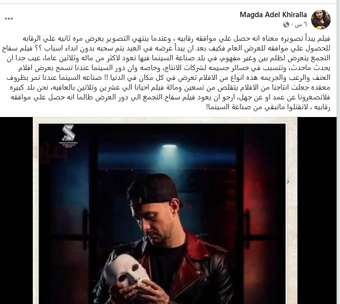 وكتبت ماجدة خير الله عبر حسابها الرسمي بموقع التواصل الاجتماعي “فيسبوك”: فيلم يبدأ تصويره معناه انه حصل علي موافقه رقابية ، وعندما ينتهي التصوير يعرض مره ثانية علي الرقابة للحصول علي موافقة للعرض العام فكيف بعد أن يبدأ عرضه في العيد، يتم سحبه بدون إبداء أسباب فيلم سفاح التجمع يتعرض لظلم بين وغير مفهوم، في بلد صناعة السينما فيها تعود لأكثر من مائه وثلاثين عاما، عيب جدا أن يحدث ما حدث.