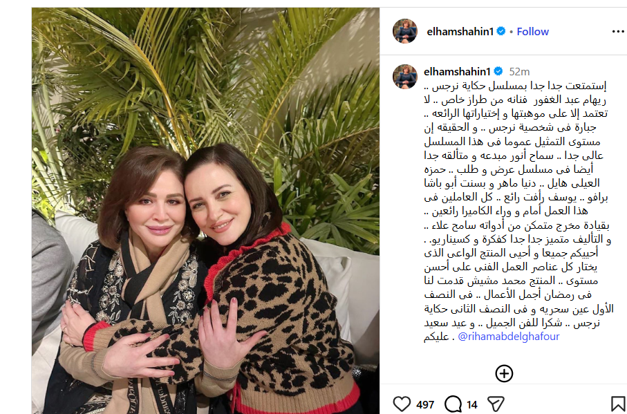 ونشرت إلهام شاهين صورة مع ريهام عبدالغفور، وذلك عبر حسابها الرسمي بموقع التواصل الاجتماعي “انستجرام”، وعلقت عليها قائلة: إستمتعت جدا جدا بمسلسل حكاية نرجس ريهام عبد الغفور فنانه من طراز خاص، لا تعتمد إلا على موهبتها و إختياراتها الرائعة، جبارة فى شخصية نرجس.