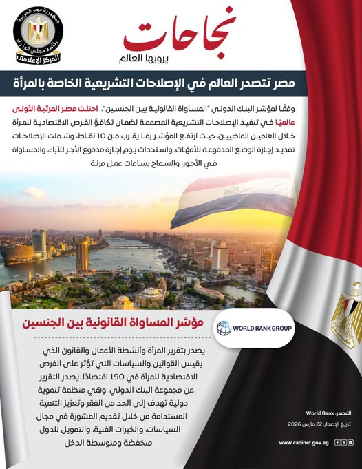 وأوضحت الحكومة أن هذه السياسات أسهمت في تعزيز النظرة الدولية لوضع المرأة في مصر، حيث احتلت البلاد المرتبة الأولى عالميًا في تنفيذ الإصلاحات التشريعية لضمان تكافؤ الفرص الاقتصادية للمرأة خلال العامين الماضيين، وفقًا لمؤشر البنك الدولي «المساواة القانونية بين الجنسين».