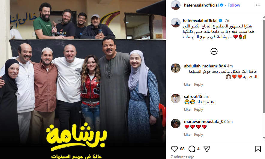 وكتب حاتم صلاح عبر حسابه الرسمي بموقع التواصل الاجتماعي “انستجرام”: شكرا للجمهور العظيم على النجاح الكبير اللي هما سبب فيه ويارب دايما عند حسن ظنكوا ، برشامة في جميع السينمات.