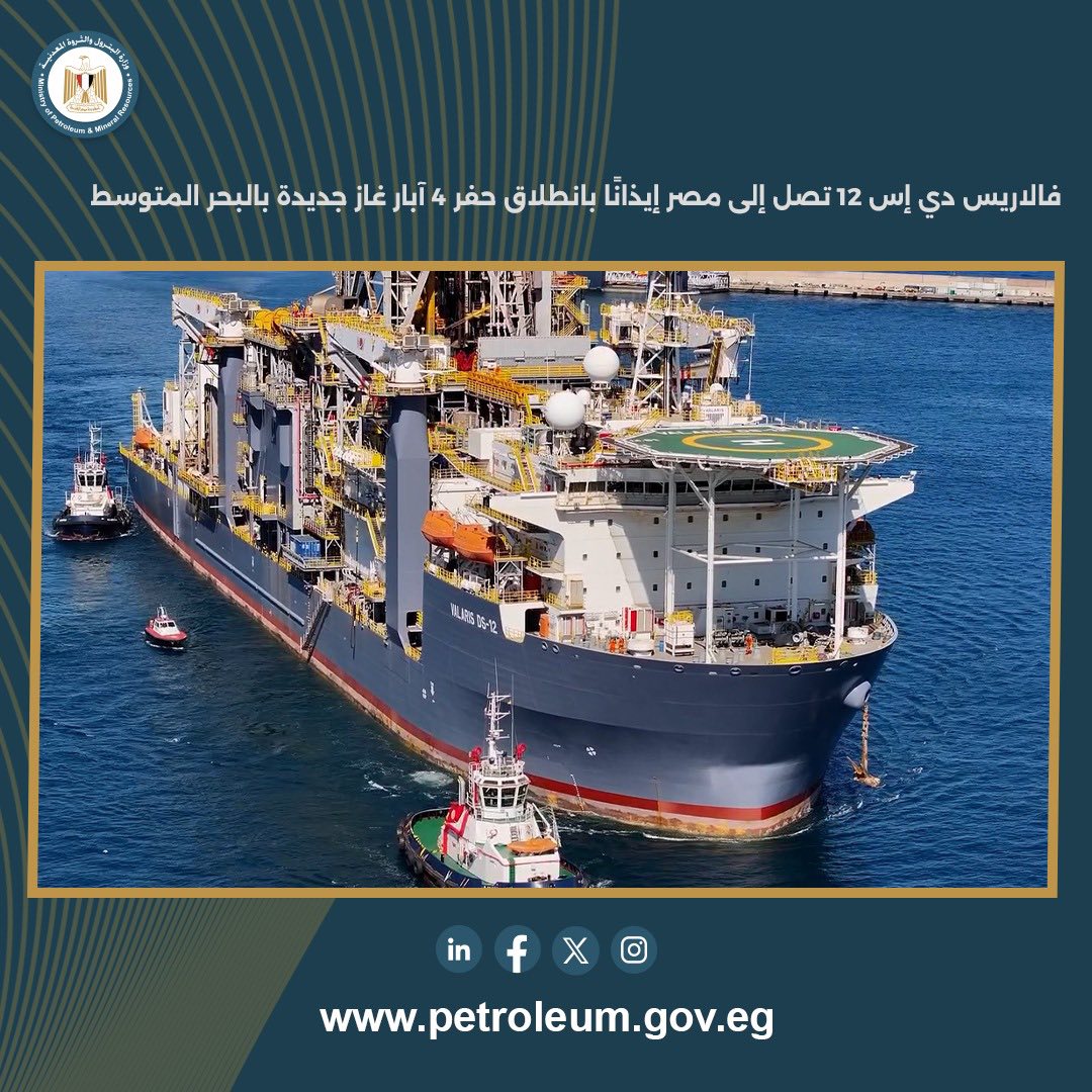 وصلت سفينة الحفر «فالاريس دي إس 12» إلى المياه الإقليمية المصرية، إيذانًا ببدء مرحلة جديدة من أنشطة حفر آبار الغاز في البحر المتوسط، ضمن برنامج يستهدف حفر 4 آبار جديدة لصالح شركتي «بي بي» البريطانية و«أركيوس إنرجي».
