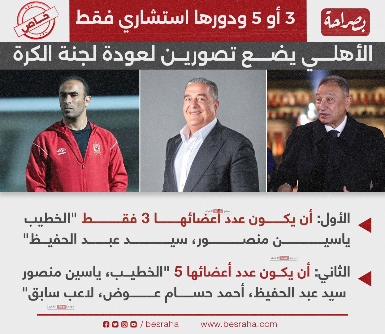 وعلم موقع "بصراحة" أن هناك تصورين مطروحين أمام إدارة الأهلي بشأن تشكيل اللجنة: