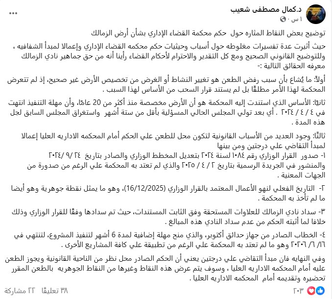 وقال كمال شعيب عبر حسابه على موقع التواصل الاجتماعي فيسبوك: «توضيح بعض النقاط المثاره حول حكم محكمة القضاء الإداري بشأن أرض الزمالك».