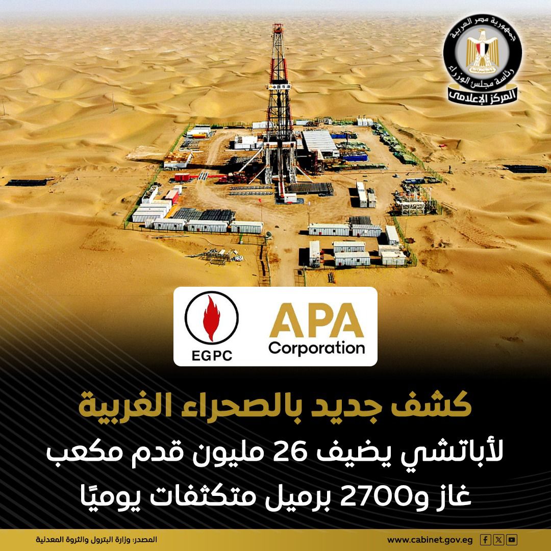 تحفيز الاستثمار في قطاع الغاز الطبيعي بدأ يترجم إلى نتائج ملموسة على أرض الواقع، مع نجاح شركة أباتشي بالتعاون مع الهيئة المصرية العامة للبترول في تحقيق كشف جديد بالصحراء الغربية، يضيف نحو 26 مليون قدم مكعب من الغاز يوميًا و2700 برميل متكثفات.