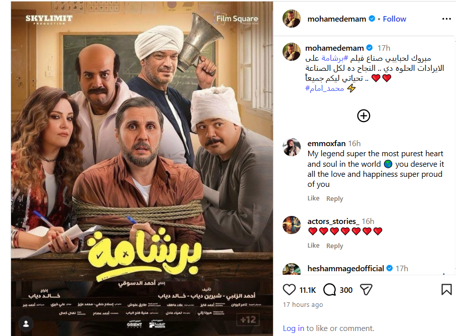 وكتب محمد إمام عبر حسابه الرسمي بموقع التواصل الاجتماعي “انستجرام”: مبروك لحبايبي صناع فيلم برشامة على الايرادات الحلوه دي النجاح ده لكل الصناعة، تحياتي ليكم جميعاً.