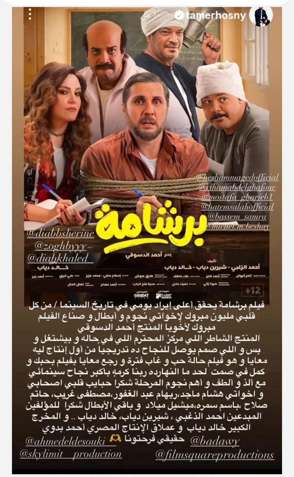 وخلال هذا النجاح المستمر، وجه النجم تامر حسني تهنئة لصناع برشامة، قائلًا "فيلم برشامة يحقق