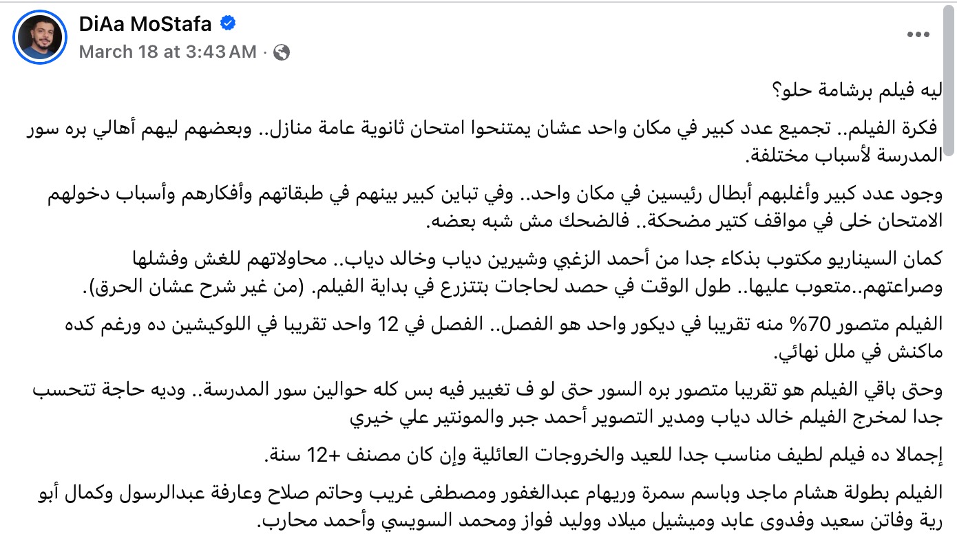 وأضاف ضياء مصطفى "السيناريو مكتوب بذكاء جدا من أحمد الزغبي وشيرين دياب وخالد دياب.. محاولاتهم للغش وفشلها وصراعتهم..متعوب عليها.. طول الوقت في حصد لحاجات بتتزرع في بداية الفيلم".