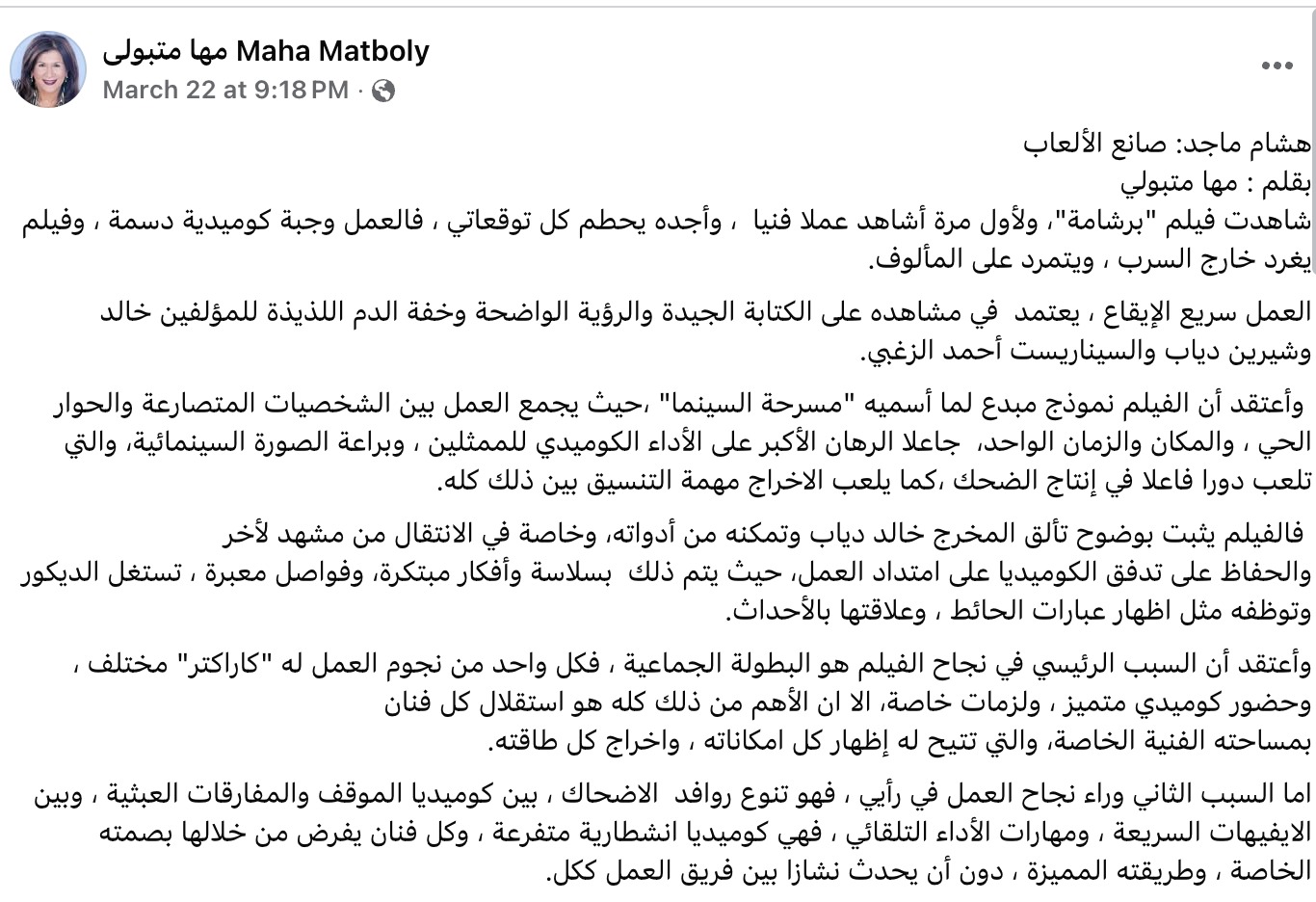 وقال المخرج محمد دياب "هدية العيد السنة دي هي فيلم برشامة! الفيلم بينضم عندي للناظر و طير انت والحرب العالمية التالتة، كأكتر أفلام معاصرة ضحكتني. خطير، كتابة وإخراج وتمثيل وديكور وتصوير وملابس وصوت وموسيقى.. كل عناصر الفيلم معمولة بإتقان. مبروك لخالد و شيرين دياب على التأليف والإخراج المميز أوي، بتعملوا حاجات معرفش أعملها وده بيخليني أنبهر كل مرة".