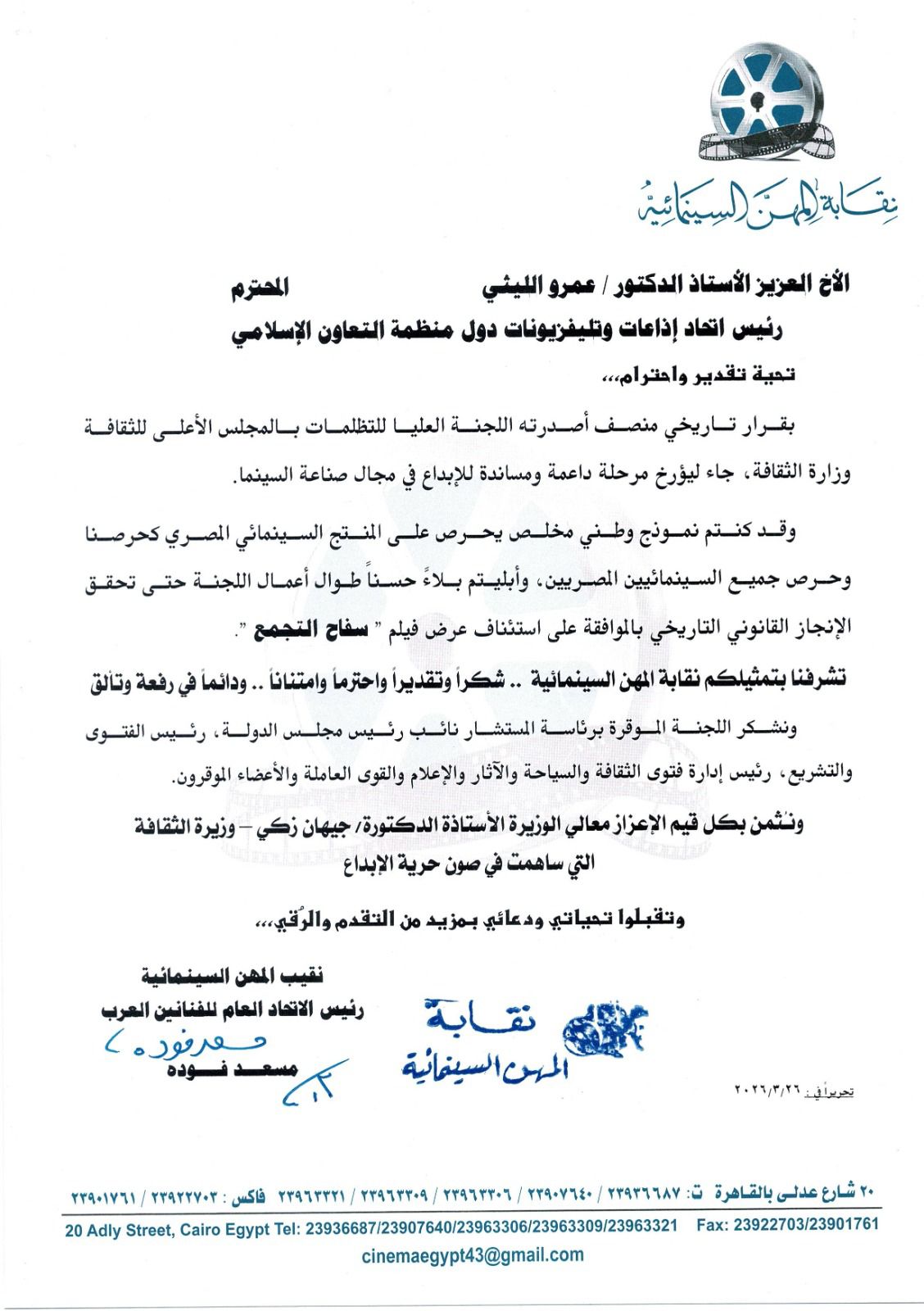 واختتم البيان: ونثمن بكل قيم الإعزاز معالي الوزيرة الأستاذة الدكتورة جيهان زكي - وزيرة الثقافة التي ساهمت في صون حرية الإبداع، وتقبلوا تحياتي ودعائي بمزيد من التقدم والرقي ، مسعد فودة نقيب المهن السينمائية، رئيس الاتحاد العام للفنانين العرب.