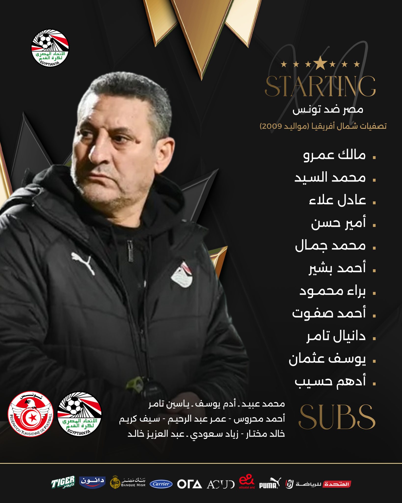 أعلن حسين عبداللطيف، المدير الفني لـ منتخب مصر مواليد 2009، عن التشكيل الأساسي الذي سيخوض مواجهة نظيره التونسي في الثانية ظهر اليوم على ملعب شهداء بنينا بمدينة بنغازي الليبية، وذلك في افتتاح مشوار المنتخب في تصفيات شمال أفريقيا، (أوناف)، المؤهلة لكأس الأمم الأفريقية تحت 17 عاماً.