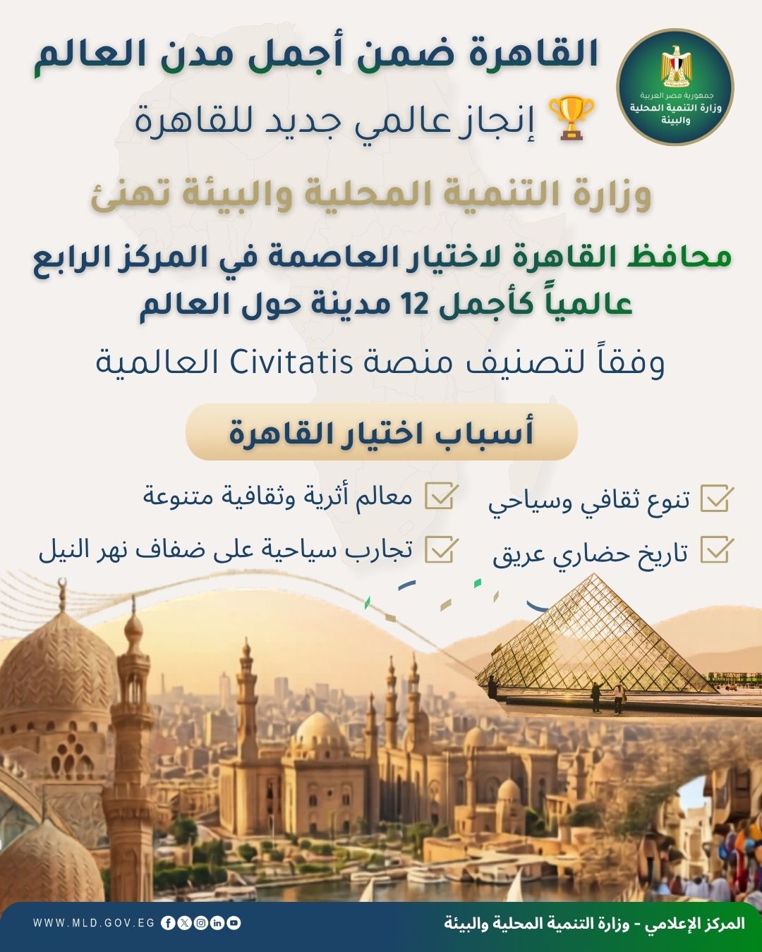 وأشارت إلى ما تتمتع به القاهرة من تنوع ثقافي ومعالم أثرية متميزة، إلى جانب التجارب السياحية والترفيهية على ضفاف نهر النيل، مما يجعلها وجهة عالمية متكاملة تستحق هذا التقدير.