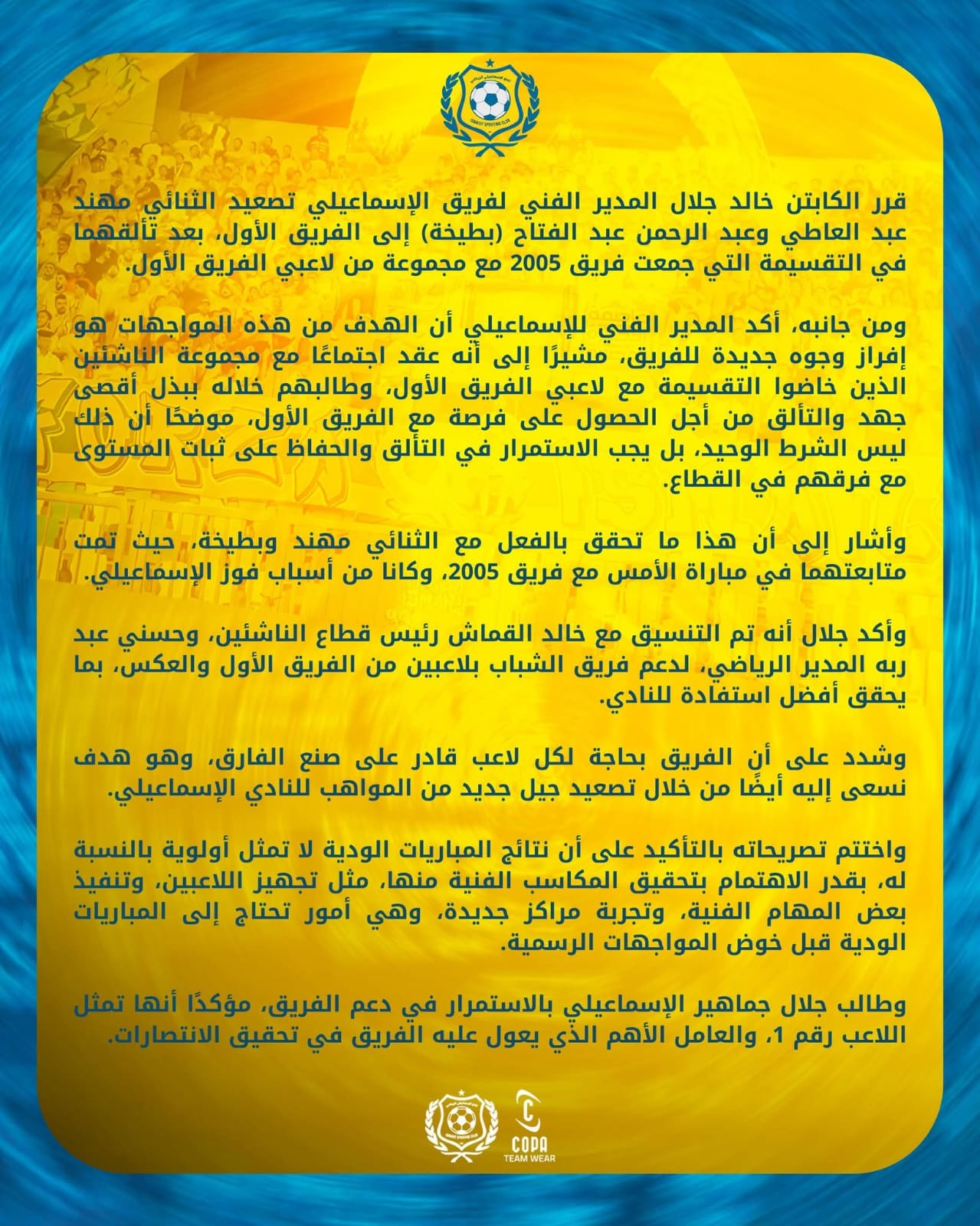 قرر الكابتن خالد جلال المدير الفني لفريق الإسماعيلي تصعيد الثنائي مهند عبد العاطي وعبد الرحمن عبد الفتاح (بطيخة) إلى الفريق الأول بعد تألقهما في التقسيمة التي جمعت فريق 2005 مع مجموعة من لاعبي الفريق الأول.
