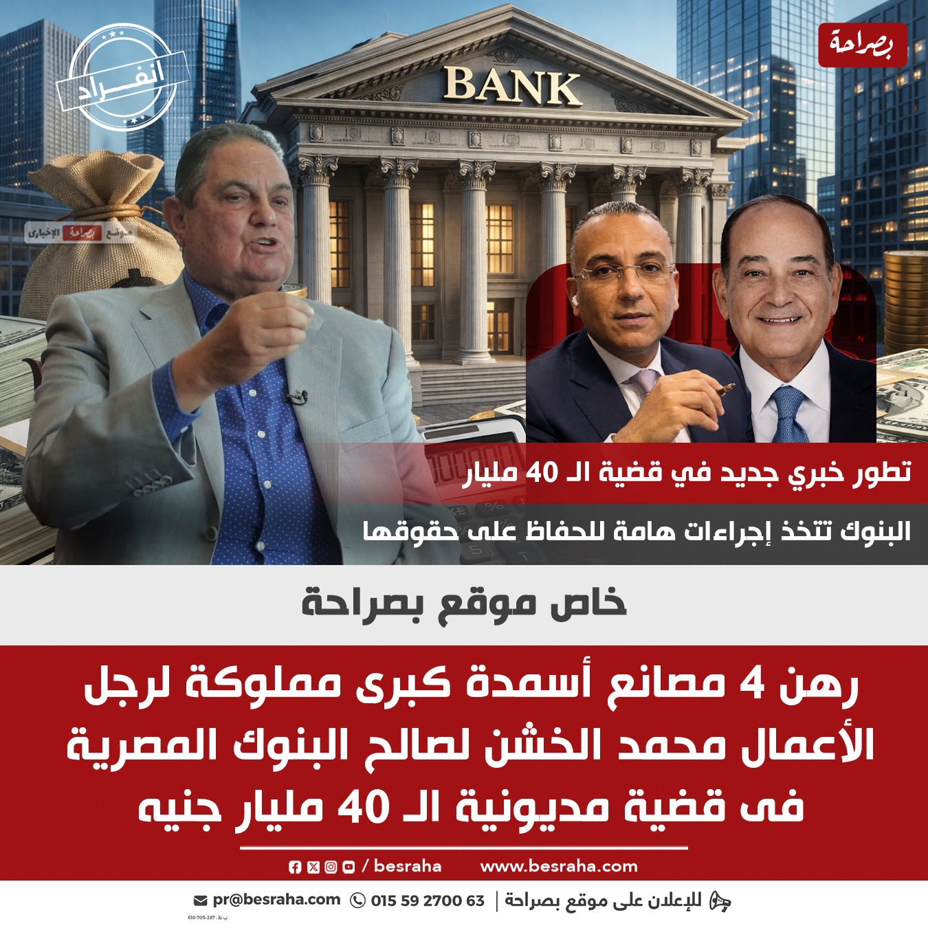 يواصل موقع بصراحة انفراده بنشر معلومات وتفاصيل جديدة فى قضية تسوية مديونيات رجل الأعمال محمد الخشن مالك شركة إيفر جرو والتى وصلت قيمتها لما يتجاوز 40 مليار جنيه بالفوائد.
