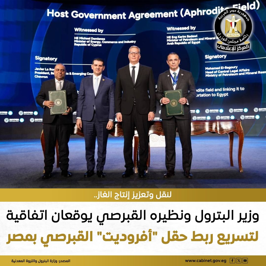 توقيع اتفاقية لتسريع تنمية وإنتاج الغاز من حقل "أفروديت" القبرصي وربطه بالبنية التحتية المصرية