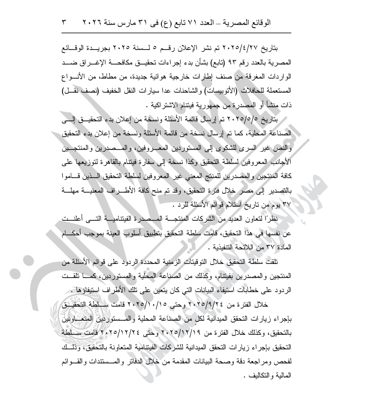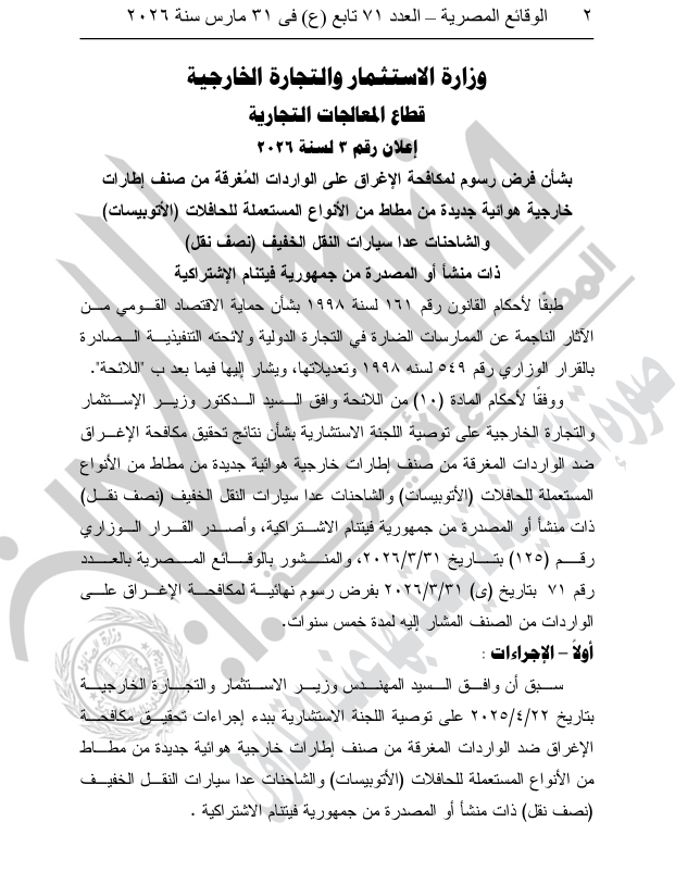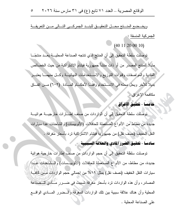نشرت الجريدة الرسمية قرار الدكتور محمد فريد، وزير الاستثمار والتجارة الخارجية، بفرض رسوم مكافحة الإغراق النهائية على واردات إطارات الحافلات والشاحنات القادمة من جمهورية فيتنام الاشتراكية، وذلك لحماية السوق المحلي والصناعة الوطنية من الممارسات التجارية غير العادلة.