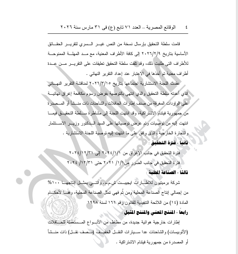 ويأتي هذا القرار في إطار حماية الصناعة المحلية من الإغراق وضمان تكافؤ الفرص للمصنعين المحليين، والحفاظ على استقرار السوق المصري.