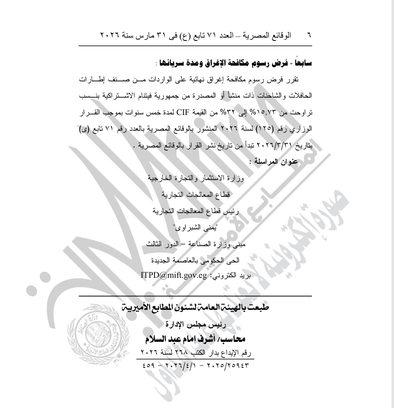 ووفقًا للقرار الوزاري رقم (125) لسنة 2026 المنشور بالعدد رقم 71 تابع (ي) بتاريخ 31 مارس 2026، تراوحت نسب الرسوم بين 15.73% و32% من قيمة CIF، وتستمر لمدة خمس سنوات اعتبارًا من تاريخ النشر بالجريدة الرسمية.