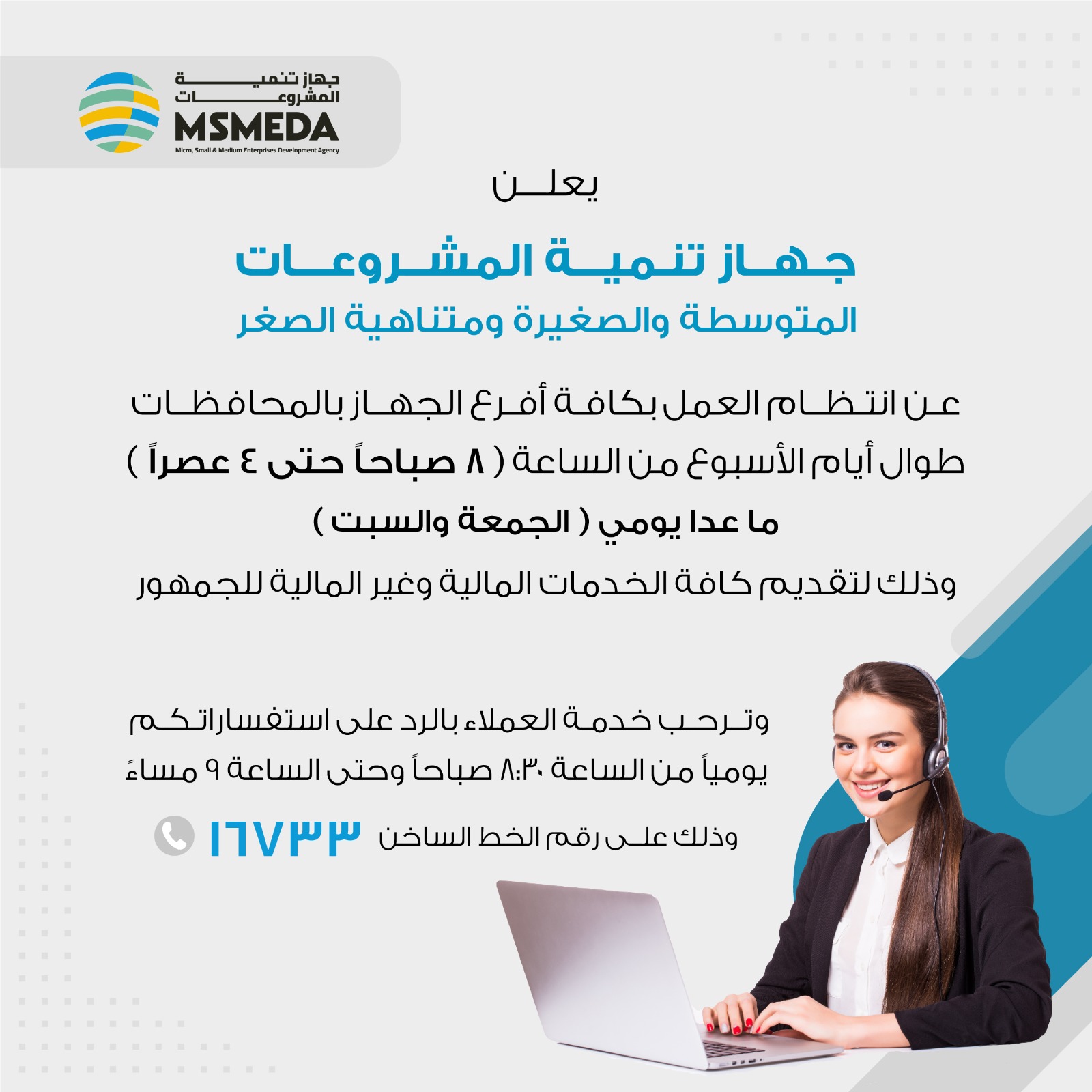 في إطار حرص الدولة على دعم قطاع المشروعات المتوسطة والصغيرة ومتناهية الصغر، وتعزيز بيئة ريادة الأعمال، أعلن جهاز تنمية المشروعات المتوسطة والصغيرة ومتناهية الصغر عن استمرار العمل بكافة أفرعه بالمحافظات طوال أيام الأسبوع، بما في ذلك يوم الأحد، وذلك من الساعة 8 صباحًا حتى 4 عصرًا (عدا يومي الجمعة والسبت).