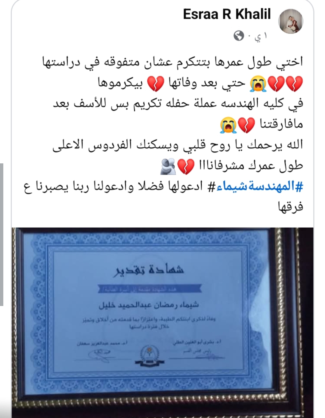 بكلماتٍ تختزل سنوات من الفخر الممزوج بمرارة الفقد، كتبت "إسراء"، شقيقة المهندسة الراحلة، منشوراً عبر حسابها الشخصي، كان أشبه برثاءٍ يلامس القلوب: "أختي طول عمرها بتتكرم عشان متفوقة في دراستها.. حتى بعد وفاتها بيكرموها.. في كلية الهندسة عملوا حفلة تكريم، بس للأسف بعد ما فارقتنا".