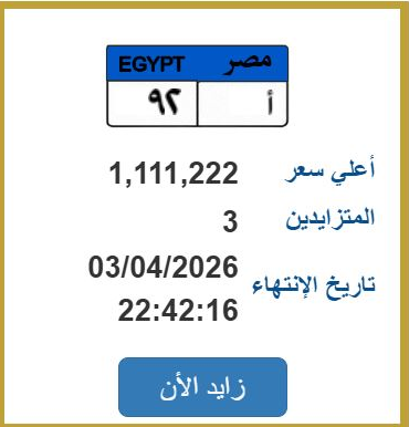 مزاد "أ 92": لوحة سيارة مميزة تكسر حاجز المليون جنيه بمشاركة 3 متنافسين