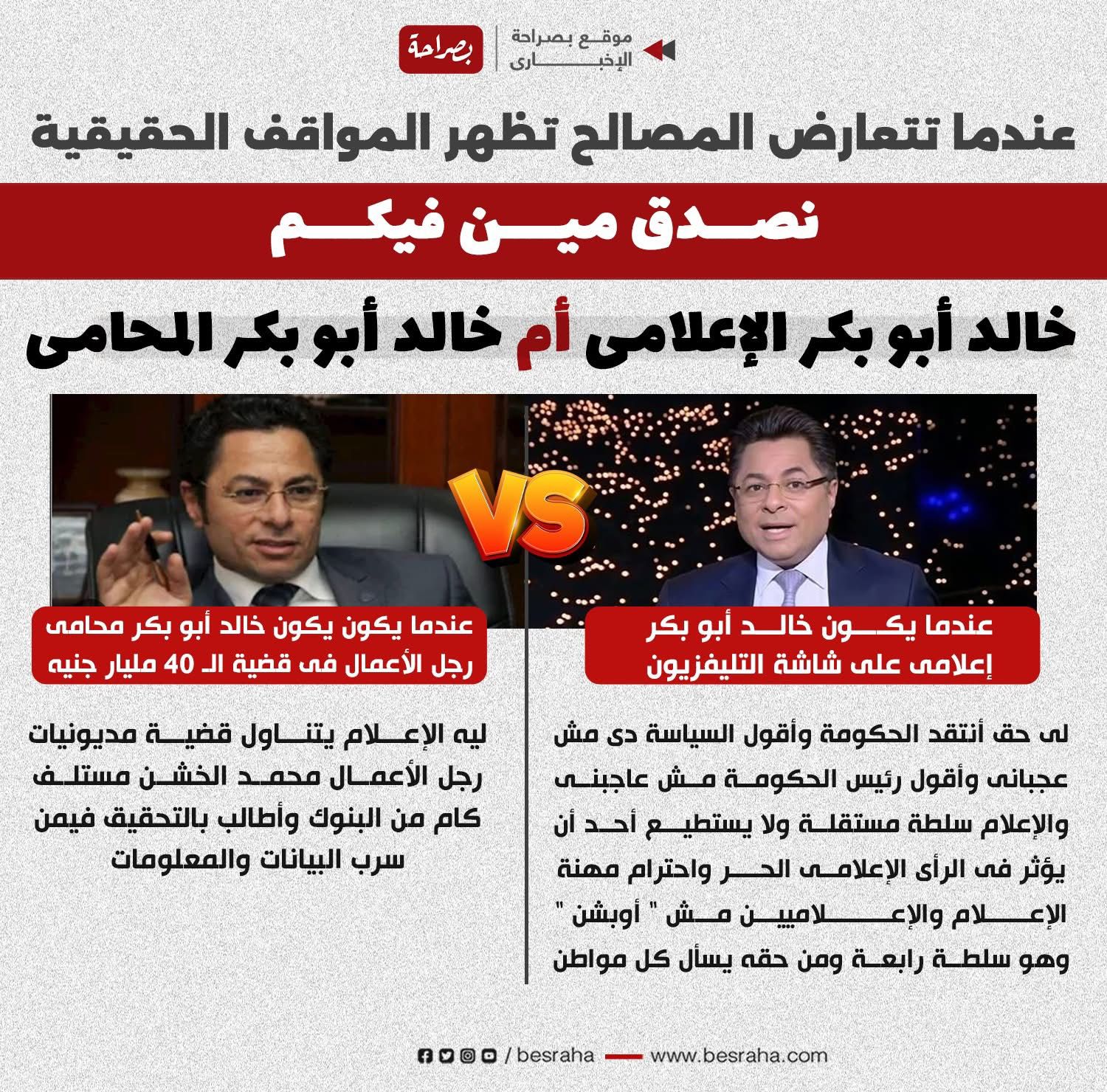 أثار المحامي والإعلامي خالد أبو بكر تساؤلات واسعة بسبب تناقض مواقفه بين دوره الإعلامي ودوره كمحامٍ عن رجل الأعمال محمد الخشن في قضية مديونية تصل إلى 40 مليار جنيه.