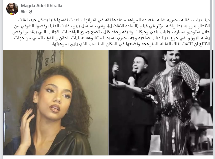 وكتبت ماجدة خير الله عبر حسابها الرسمي بموقع التواصل الاجتماعي “فيسبوك”: دينا دياب فنانة مصرية شابة متعددة المواهب، عندها ثقه في قدراتها اعدت نفسها فنيا بشكل جيد، لفتت الأنظار بدور بسيط ولكنه مؤثر في فيلم الساده الافاضل وفي مسلسل بيبو،قلبت الدنيا برقصها الشرقي من خلال ستوديو سماره جلباب بلدي وحركات رشيقه وخفه ظل تضع جميع الراقصات الأجانب، فنانة متوهجة وتضعها في المكان المناسب الذي يليق بموهبتها.