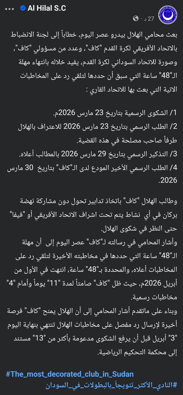 وأشار المحامي في رسالته لـ"كاف" عصر اليوم إلى أن مهلة الـ"48" ساعة التي حددها في مخاطبته الأخيرة لتلقي رد على المخاطبات أعلاه، والمحددة بـ"48" ساعة، انتهت في الأول من أبريل 2026م، حيث ظل "كاف" صامتاً لمدة "11" يوماً وأمام "4" مخاطبات رسمية.