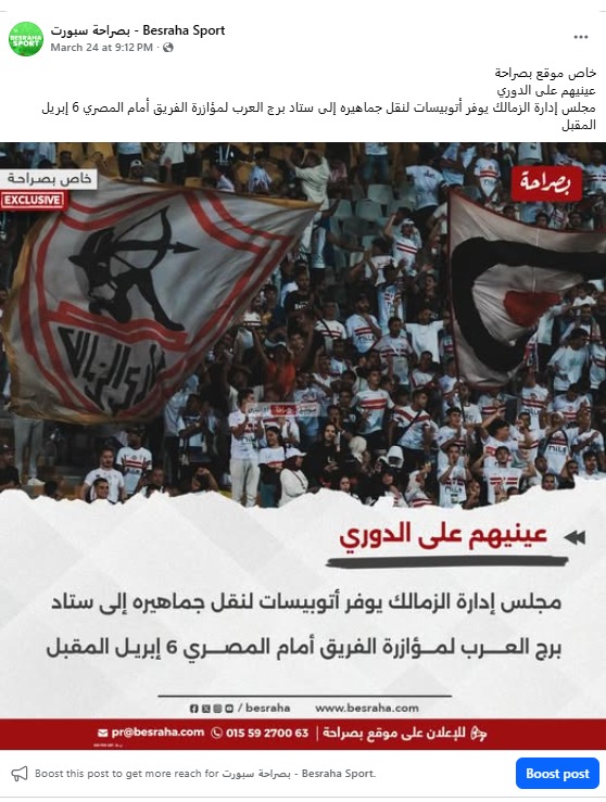 وجاء إعلان حسام المندوه توفير حافلات لجماهير الزمالك تأكيدًا لخبر موقع بصراحة، حيث أكد الموقع بتاريخ 24 مارس، أن مجلس الزمالك سيقوم بتوفير حافلات تيسيرًا على الجماهير.