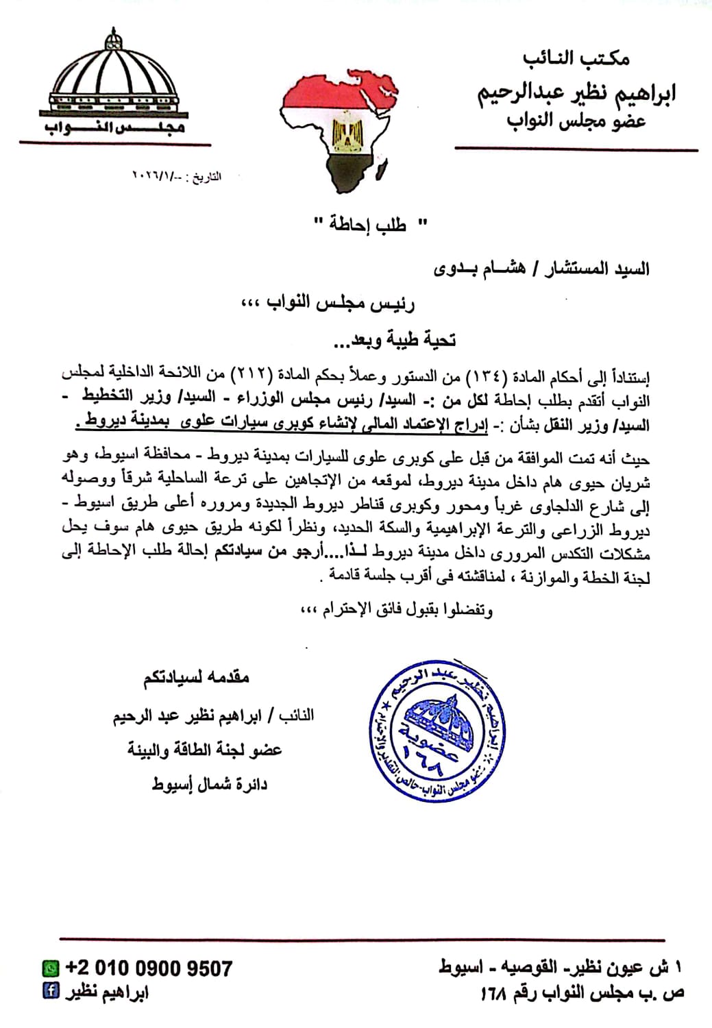 بطلب إحاطة للحكومة.. النائب إبراهيم نظير يطالب بربط شرق ديروط وغربها بكوبري أعلى السكة الحديد