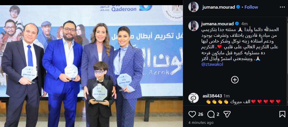 ونشرت جومانا مراد صورة من التكريم، وذلك عبر حسابها الرسمي بموقع التواصل الاجتماعي "انستجرام"، وعلقت عليها قائلة: الحمدلله دائما وأبدا ممتنه جدا بتكريمي من مبادرة قادرون باختلاف، وتشرفت بوجود ودعم أستاذه زينة توكل وشكر خاص ليها على التكريم الغالي على قلبي، التكريم ده مسئولية كبيرة قبل مايكون فرحه وبيشجعني استمرّ وأبذل أكتر.
