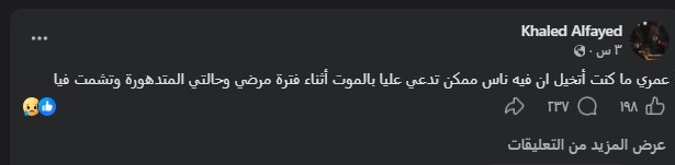 وفي منشور آخر، قال خالد الفايد: "عمري ما كنت أتخيل إن فيه ناس ممكن تدعي عليا بالموت أثناء فترة مرضي وحالتي المتدهورة وتتشمت فيا".