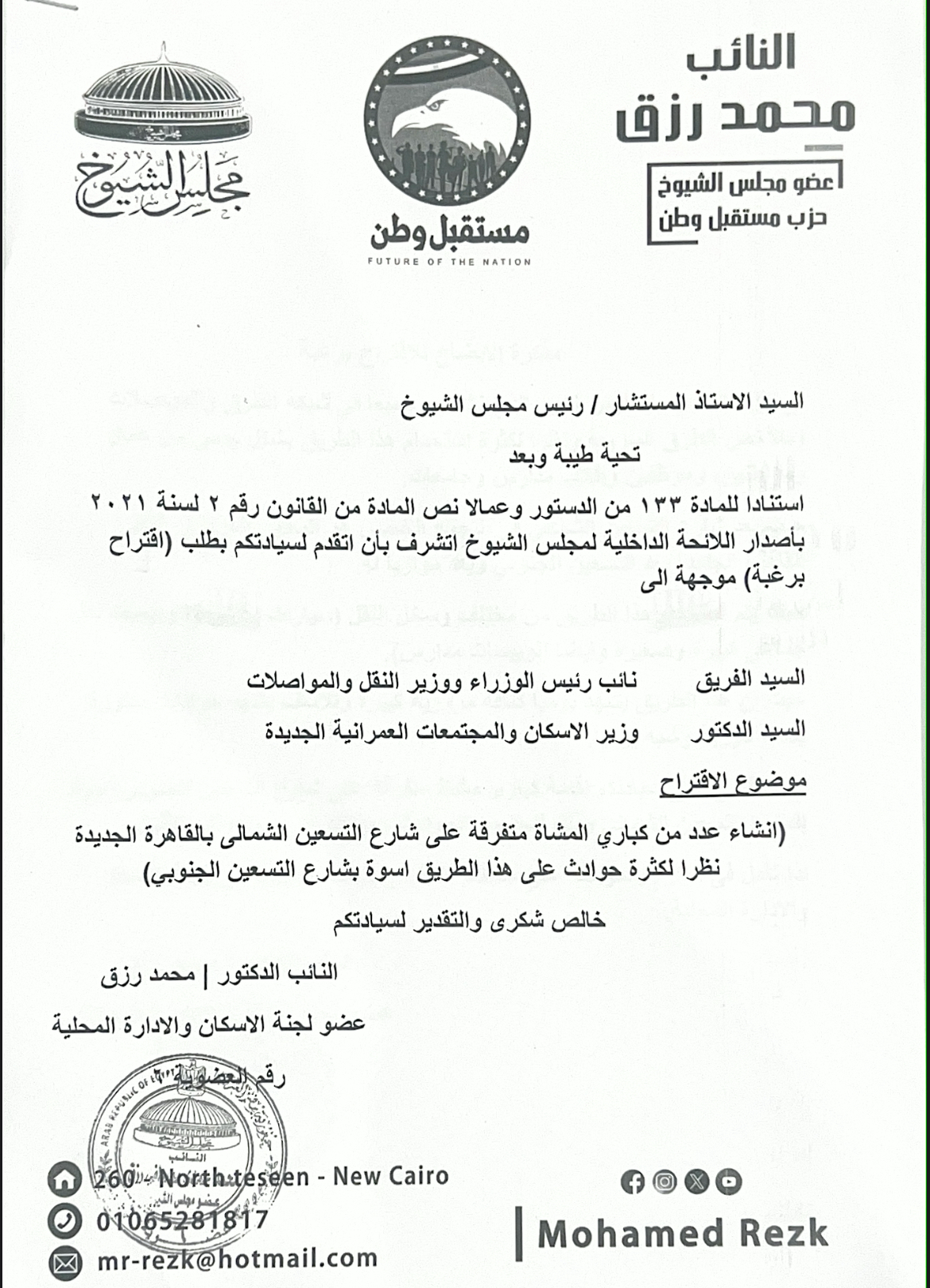 كما تقدم فيما سبق باقتراح برغبة إلى السيد المستشار رئيس مجلس الشيوخ، موجّه إلى كل من نائب رئيس مجلس الوزراء ووزير الصحة والسكان، ووزير الإسكان والمرافق والمجتمعات العمرانية، ووزيرة التنمية المحلية، ووزير المالية، بشأن تخصيص قطعة أرض غير مستغلة لإنشاء مستشفى طوارئ تخدم الطريق السريع الرابط بين القاهرة الجديدة والشروق وبدر والعاصمة الإدارية الجديدة.