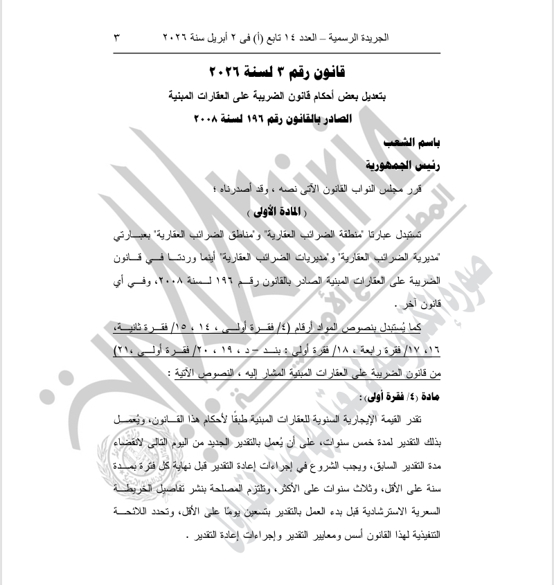 وافق الرئيس عبدالفتاح السيسي رئيس الجمهورية، على قانون رقم 3 لسنة 2026، بشأن تعديل بعض أحكام قانون الضريبة على العقارات المبنية الصادر بالقانون رقم 196 لسنة 2008.