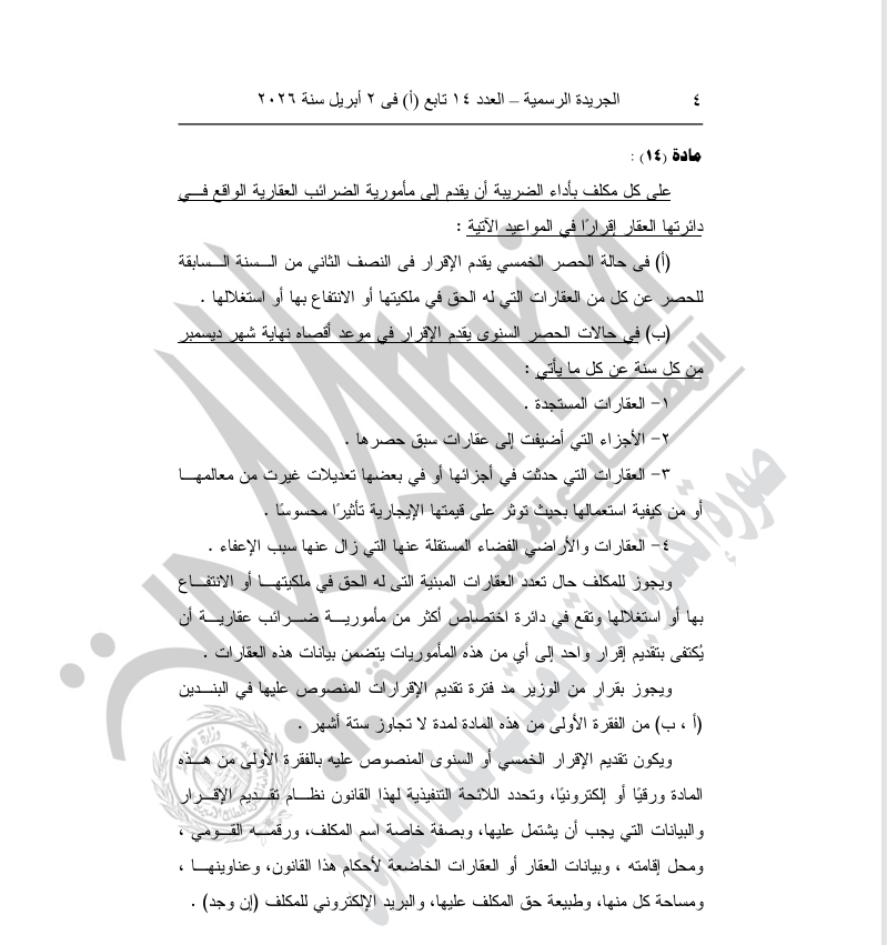 على كل مكلف بأداء الضريبة أن يقدم إلى مأمورية الضرائب العقارية الواقع في دائرتها العقار إقرارا في المواعيد الآتية: