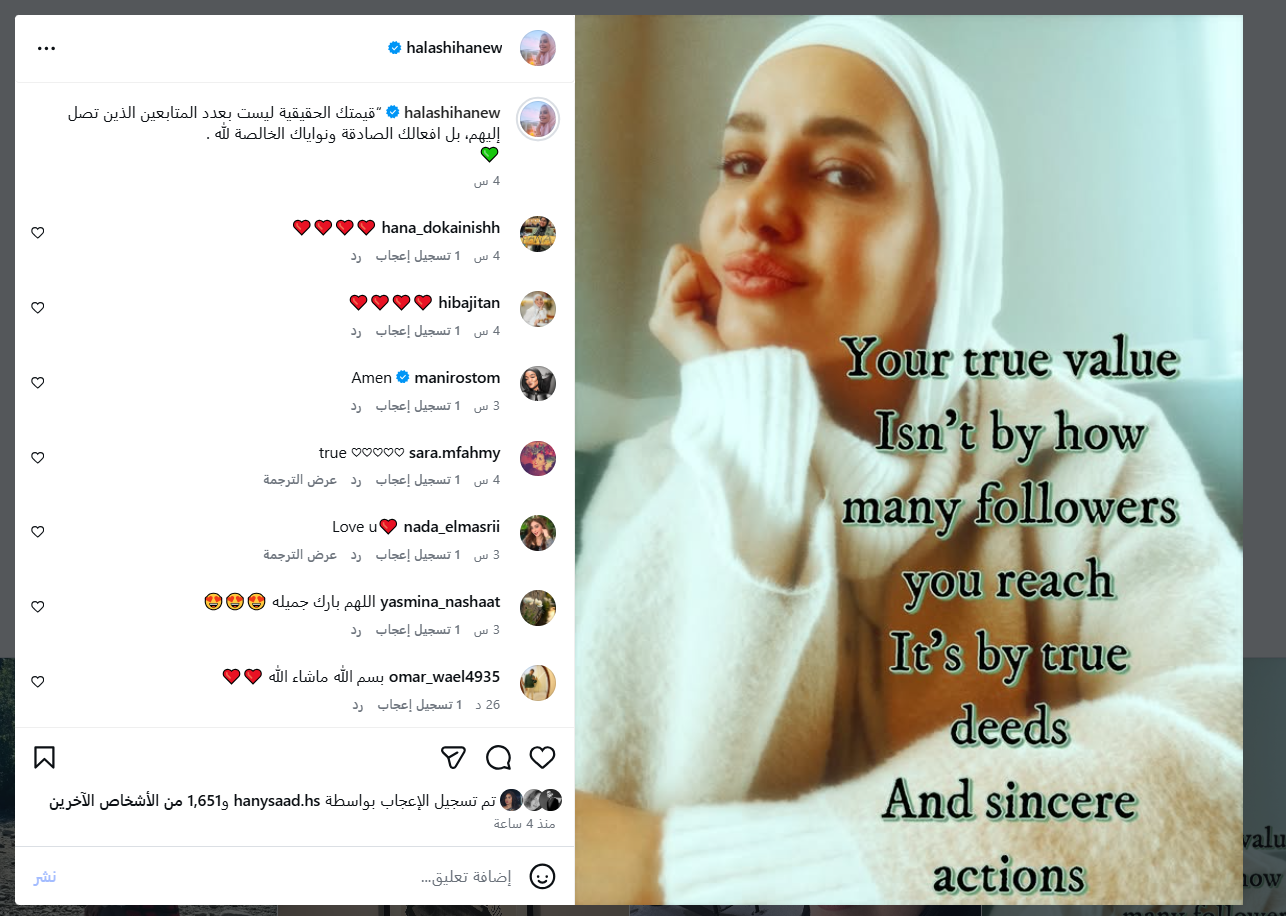قامت حلا شيحة بنشر منشور عبر خاصية الاستوري على حسابها الشخصي بموقع التواصل إنستغرام، معلقةً: "قيمتك الحقيقية ليست بعدد المتابعين الذين تصل إليهم، بل بأفعالك الصادقة ونواياك الخالصة لله".