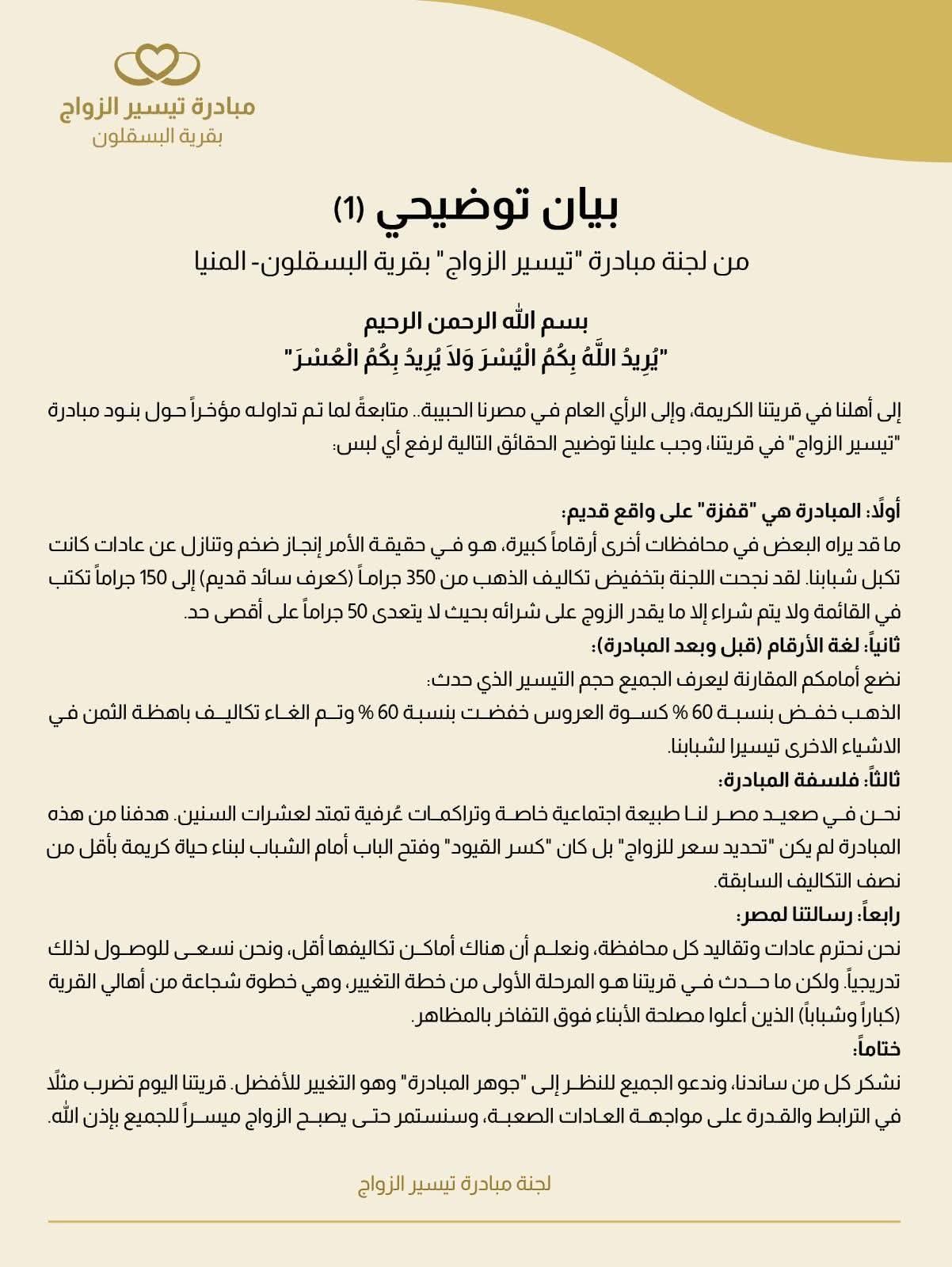 واختتمت اللجنة بيانها بالتأكيد على أن ما حدث داخل القرية يمثل خطوة أولى نحو التغيير التدريجي، داعية إلى دعم الفكرة وتطويرها بما يتناسب مع الواقع، بما يحقق الهدف الأسمى وهو تيسير الزواج أمام الشباب وبناء أسر مستقرة.