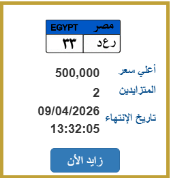 سجل المزاد حتى الآن 500 ألف جنيه على اللوحة التي تحمل رقم "ر ع د 33" وتزايد على اللوحة شخصين حتى الآن، ومن المقرر انتهاء المزايدة على اللوحة في 9 أبريل.