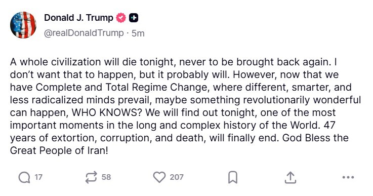 حذر الرئيس الأمريكي دونالد ترامب من احتمال وقوع حدث وصفه بـ"اندثار حضارة بأكملها"، مشيرًا إلى أنه لا يرغب في حدوث ذلك، لكنه يرى أنه أمر مرجح.