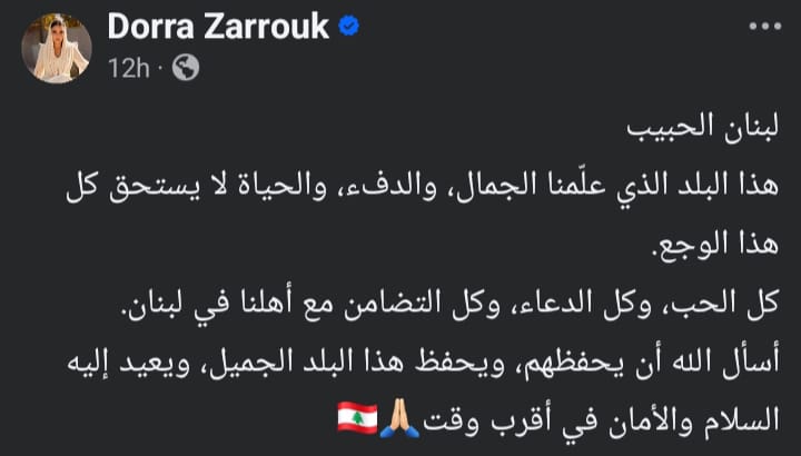 وكتبت درة عبر حسابها الرسمي بموقع التواصل الاجتماعي “انستجرام”: هذا البلد الذي علّمنا الجمال، والدفء والحياة لا يستحق كل هذا الوجع كل الحب وكل الدعاء وكل التضامن مع أهلنا في لبنان، أسأل الله أن يحفظهم ويحفظ هذا البلد الجميل، ويعيد إليه السلام والأمان في أقرب وقت.