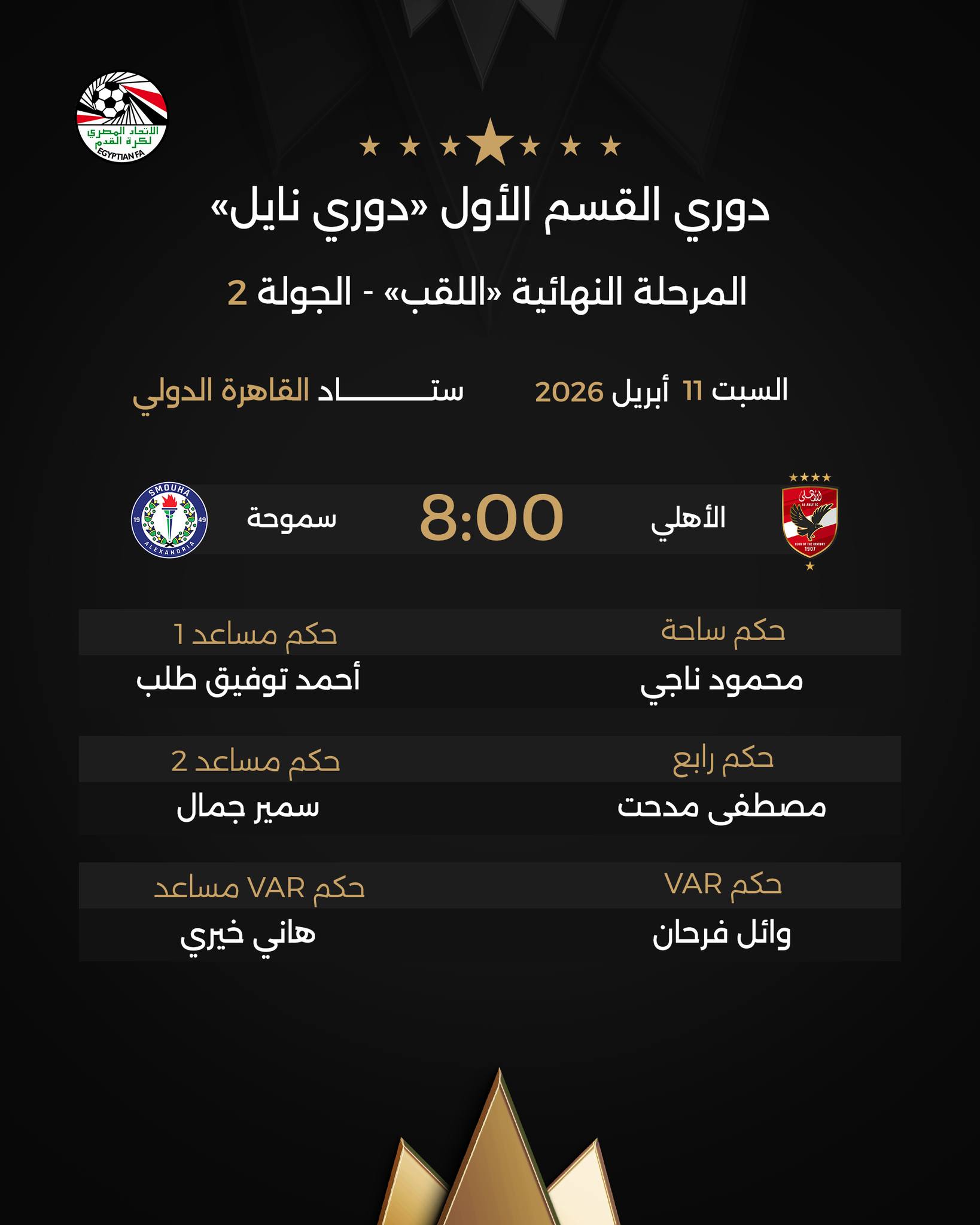 وجاء طاقم حكام مباراة الأهلي وسموحة على النحو التالي: