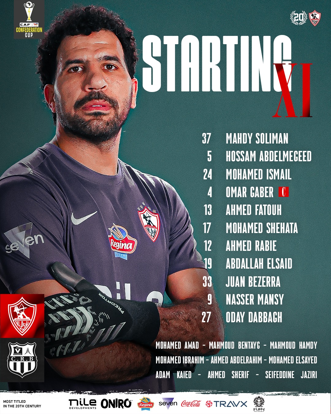 ويتواجد على مقاعد البدلاء، محمد عواد ومحمود بنتايج ومحمود حمدي "الونش" ومحمد إبراهيم وأحمد عبد الرحيم "إيشو" ومحمد السيد وآدم كايد وأحمد شريف وسيف الجزيري