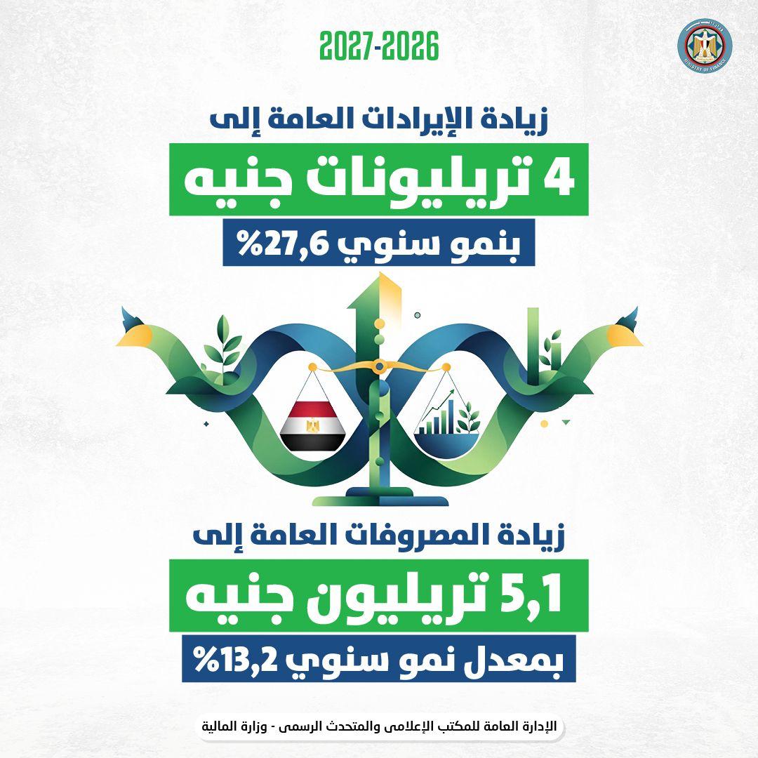 أوضح أن الإيرادات العامة المستهدفة خلال العام المالى المقبل تبلغ ٤ تريليونات جنيه بزيادة ٢٧,٦٪ وأن المصروفات العامة المتوقعة تبلغ ٥,١ تريليون جنيه بمعدل نمو ١٣,٢٪