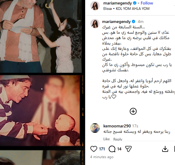 ونشرت مريم الجندي فيديو مجمعة لصورة لها تجمعها بوالدها الراحل في مراحلة عمرية مختلفة، وذلك عبر حسابها الرسمي بموقع التواصل الاجتماعي “انستجرام”، وعلقت عليها قائلة: السنة السابعة من غيرك، عدى 7 سنين والوجع لسه زي ما هو، بس مكانك في قلبي برضه زي ما هو، محدش بيقدر يملاه، بفتكرك في كل المواقف، وعارفة إنك على طول معايا، بس كل حاجة حلوة ناقصة من غيرك.