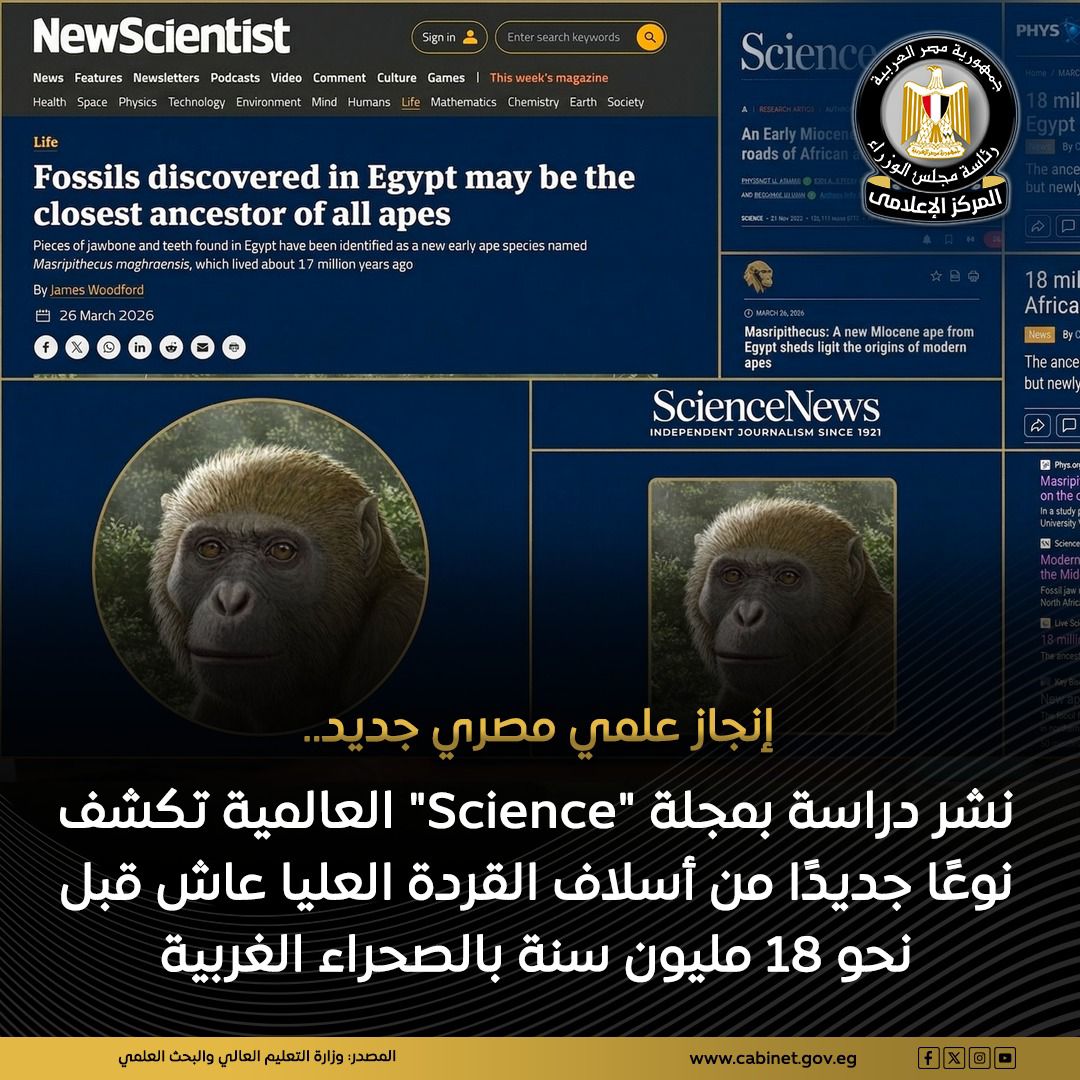 تناولت الدراسة اكتشاف نوع جديد يحمل اسم مَصريبثيكس موغراينسيس (Masripithecus moghraensis)، عاش قبل نحو 18 مليون سنة خلال العصر الميوسيني المبكر، وتم العثور على حفرياته في الصحراء الغربية، ليُعد أول دليل مؤكد على وجود أسلاف القردة العليا في شمال إفريقيا، ما يؤكد أن المنطقة كانت مركزًا رئيسيًا لتطورها.