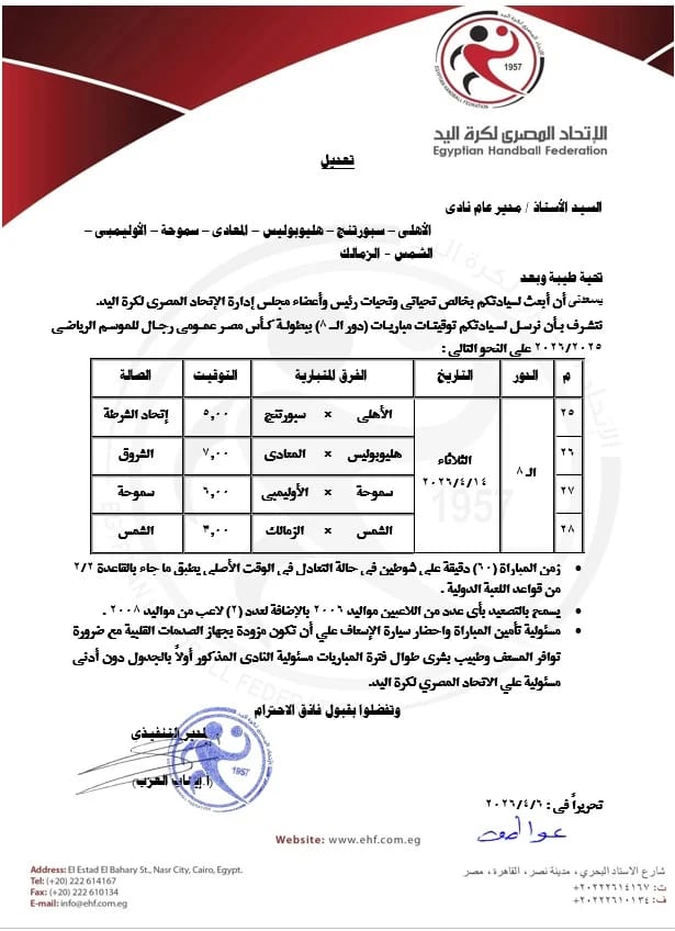 يُذكر أن منافسات دوري المحترفين لكرة اليد للرجال تختتم يوم 24 أبريل الجاري، بمواجهة قمة مرتقبة بين الأهلي والزمالك، في ختام موسم شهد منافسة قوية قبل أن يحسم الأهلي اللقب لصالحه.