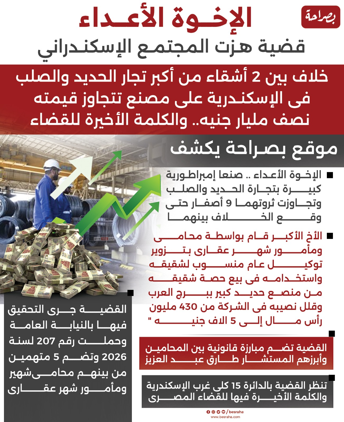 ينشر موقع بصراحة الإخبارى واحدة من أهم القضايا المثيرة للجدل فى المحاكم المصرية ، قضية يتجاوز حجم النزاع فيها ما يقارب نصف مليار جنيه ويرتبط الخلاف الأساسى فيها بـ 2 من أكبر تجار الحديد والصلب فى الإسكندرية والمالكين لأهم وأكبر شركة لتجارة الحديد والصلب والمفاجأة أنهما أشقاء