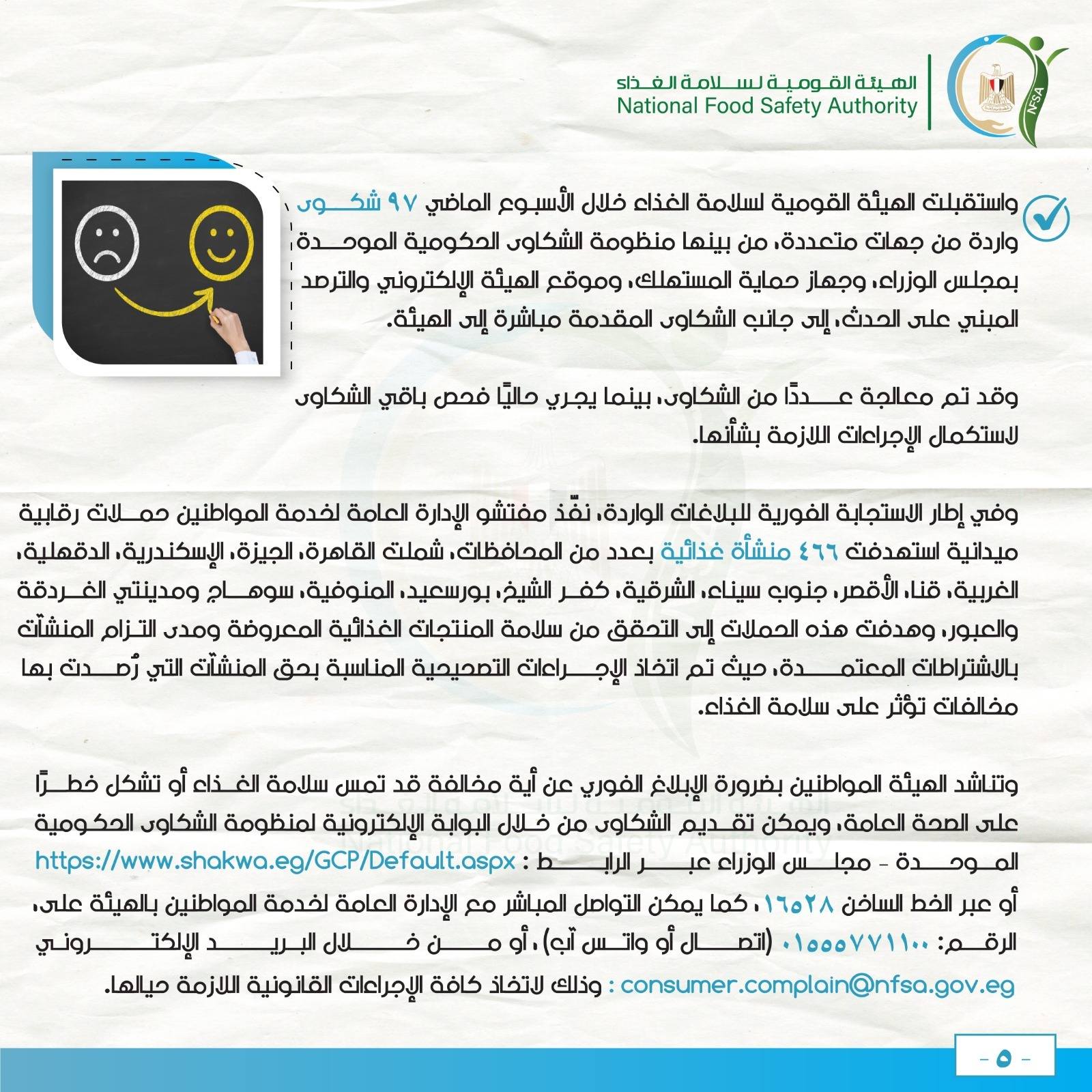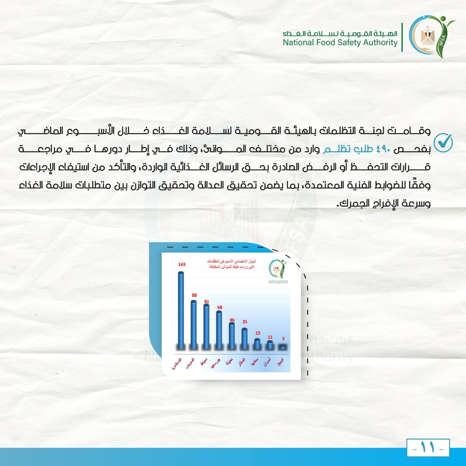 واستقبلت الهيئة القومية لسلامة الغذاء خلال الأسبوع الماضي 97 شكوى واردة من جهات متعددة، من بينها منظومة الشكاوى الحكومية الموحدة بمجلس الوزراء، وجهاز حماية المستهلك، وموقع الهيئة الإلكتروني والترصد المبني على الحدث، إلى جانب الشكاوى المقدمة مباشرة إلى الهيئة.