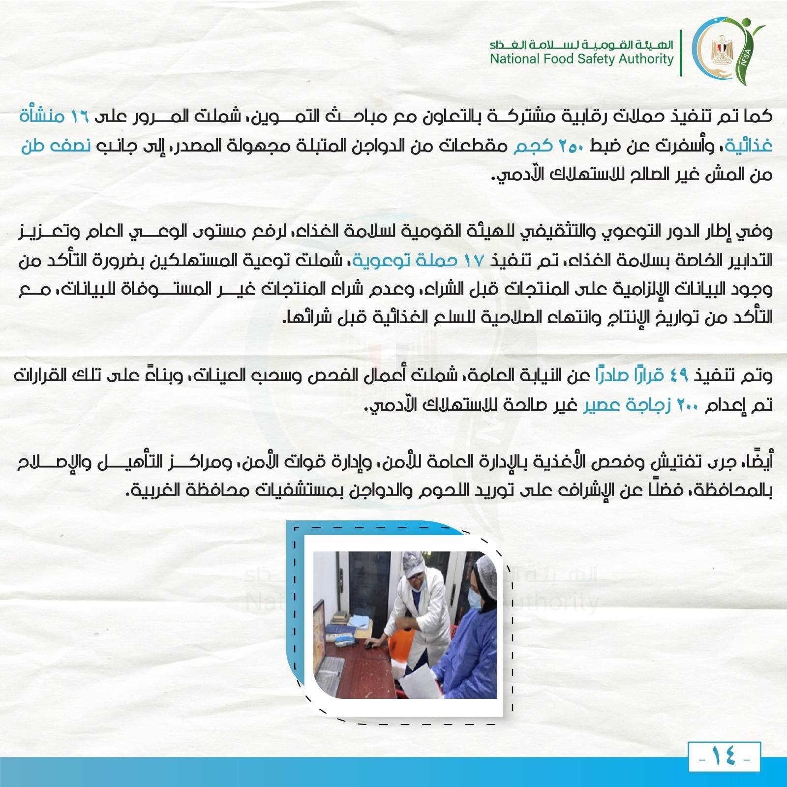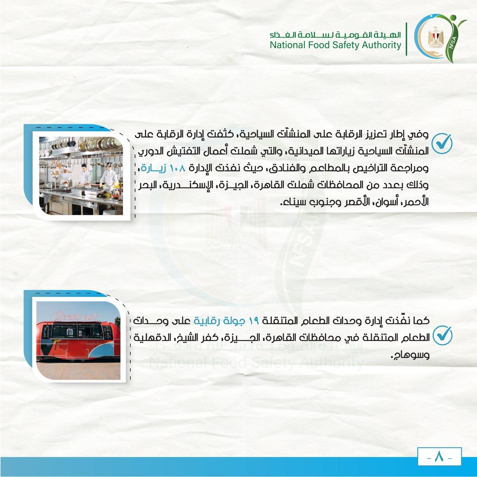 كما نفّذت إدارة وحدات الطعام المتنقلة 19 جولة رقابية على وحدات الطعام المتنقلة في محافظات القاهرة، الجيزة، كفر الشيخ، الدقهلية وسوهاج.