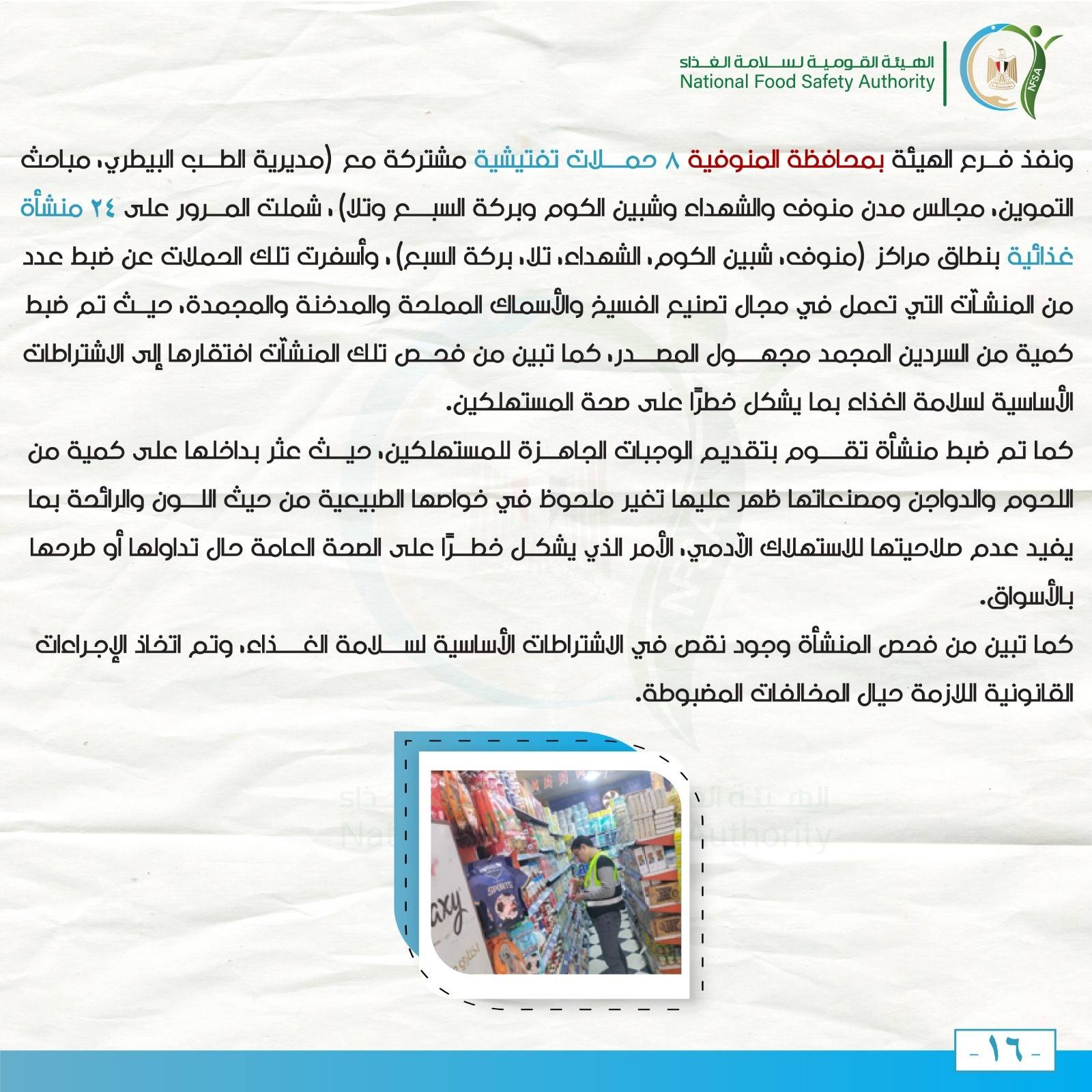 ونفذ فرع الهيئة بمحافظة المنوفية 8 حملات تفتيشية مشتركة مع (مديرية الطب البيطري، مباحث التموين، مجالس مدن منوف والشهداء وشبين الكوم وبركة السبع وتلا)، شملت المرور على 24 منشأة غذائية بنطاق مراكز (منوف، شبين الكوم، الشهداء، تلا، بركة السبع).