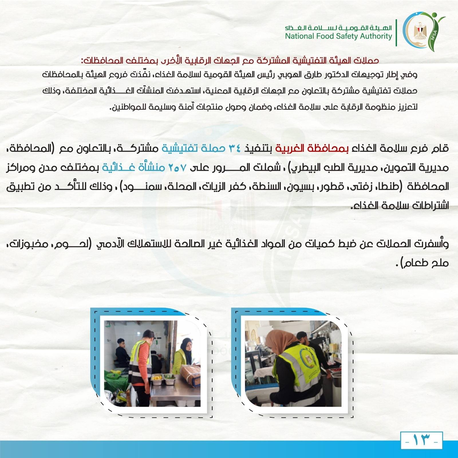 قام فرع سلامة الغذاء بمحافظة الغربية بتنفيذ 34 حملة تفتيشية مشتركة، بالتعاون مع (المحافظة، مديرية التموين، مديرية الطب البيطري)، شملت المرور على 257 منشأة غذائية بمختلف مدن ومراكز المحافظة (طنطا، زفتى، قطور، بسيون، السنطة، كفر الزيات، المحلة، سمنود)، وذلك للتأكد من تطبيق اشتراطات سلامة الغذاء.